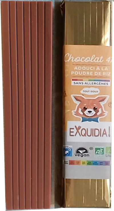 1 MINI BARRE STRIÉE en chocolat 47% adouci à la poudre de riz BIO vegan sans allergènes Exquidia, créée dans notre atelier. Tient bien dans les mains des tout-petits.