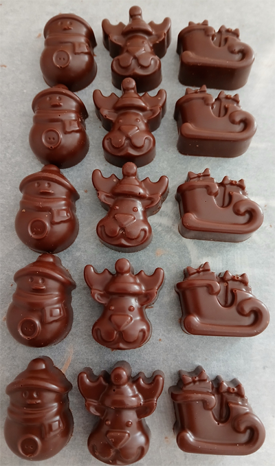 15 PERSONNAGES DE NOËL (BONHOMMES DE NEIGE, RENNES et TRAINEAUX DU PÈRE NOËL) en chocolat 47% adouci à la poudre de riz BIO vegan sans allergènes Exquidia, créés dans notre atelier. A offrir ou à s'offrir.