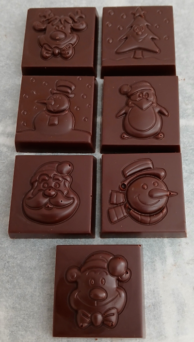 7 carrés de NOËL en chocolat NOIR ONCTUEUX 60% BIO vegan sans allergènes Exquidia : RENNE, OURSON, PÈRE NOËL, BONHOMME DE NEIGE, SAPIN DE NOËL, PINGOUIN. Emballage : jolie petite maison maison TAUPE.
