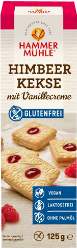 9 biscuits fourrés croustillants et fins aux framboises et crème vanille vegan sans allergènes Hammermülhe. Ils combinent tout ce qu'un biscuit parfait devrait avoir : sucré, croquant et fruité. De plus, ils sont non seulement jolis, mais ils ont aussi un goût incroyablement délicieux. Parfait pour grignoter, grignoter et grignoter.