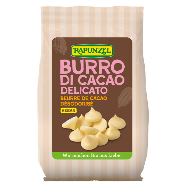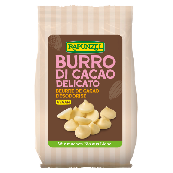 BEURRE DE CACAO en gouttes BIO vegan sans allergènes RAPUNZEL. Le beurre de cacao pur et neutre en goût et facile à doser grâce à sa présentation en gouttes.