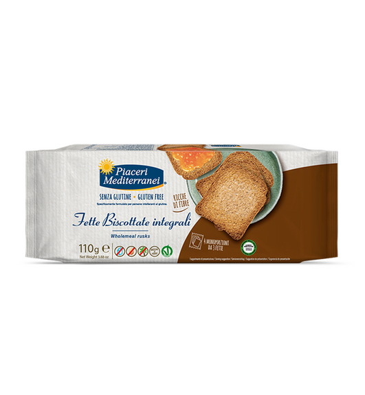 BISCOTTES complètes (Fette Biscottate Integrali) vegan, sans allergènes, sans huile de palme Piaceri Mediterranei. Croquantes, savoureuses, ces biscottes vous apportent légèreté et bien-être dès le matin. Savourez-les comme vous le souhaitez, où que vous soyez, grâce à leur format individuel pratique.