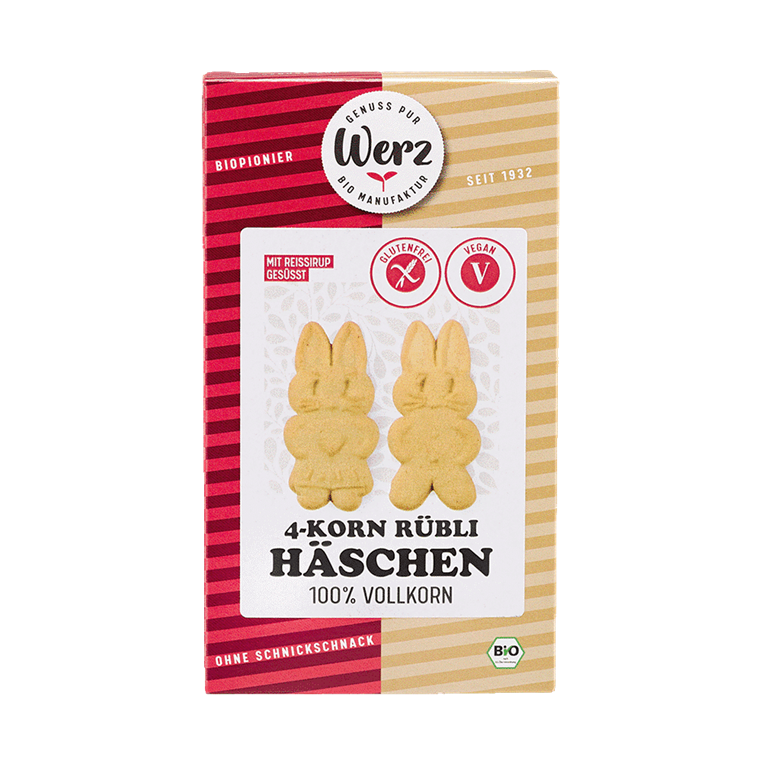 Biscuits LAPINS légers et croustillants BIO, vegan, sans gluten, sans lait, sans lactose, sans œufs, sans soja, sans arachide, sans céleri, sans sésame, sans lupin, sans moutarde, sans poisson, sans mollusque, sans crustacé, sans sulfites, sans sucre de canne Werz. Ces adorables petits lapins sont parfaits pour une pause gourmande et croustillante avec une tasse de thé.