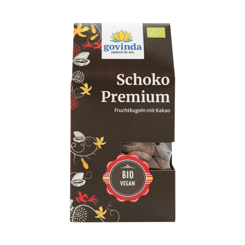 Boules Chocolat PREMIUM à base de dattes* issues du commerce équitable et cacao* BIO, vegan, sans gluten, sans lait, sans lactose, sans œufs, sans soja, sans arachide, sans céleri, sans lupin, sans moutarde, sans poisson, sans mollusque, sans crustacé, sans sulfites, sans sucre ajouté GOVINDA. Un plaisir chocolaté intense sans sucre ajouté à partager.