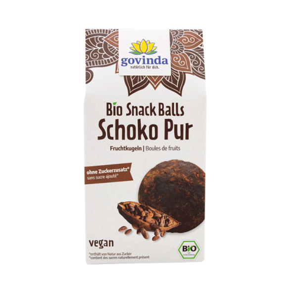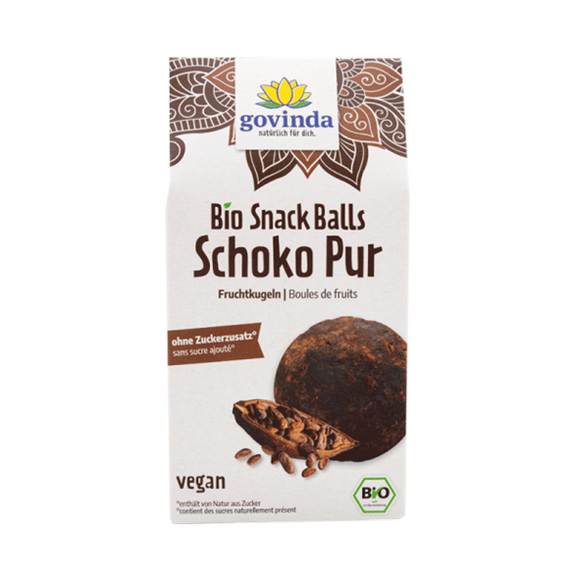 Boules Chocolat PUR à base de dattes* issues du commerce équitable et cacao* BIO, vegan, sans gluten, sans lait, sans lactose, sans œufs, sans soja, sans arachide, sans céleri, sans lupin, sans moutarde, sans poisson, sans mollusque, sans crustacé, sans sulfites, sans sucre ajouté GOVINDA. Un cacao extra chocolaté et des éclats de cacao croquants, une texture extra onctueuse et fondante grâce au beurre de cacao crémeux ; l’accomplissement de tous vos rêves chocolatés dans une petite sphère.
