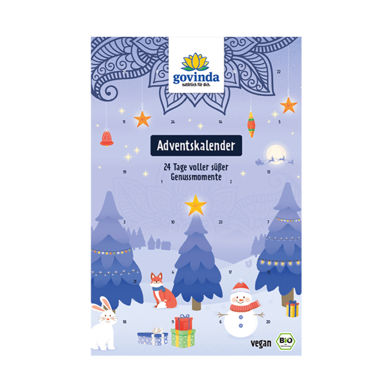 CALENDRIER de l'Avent BIO, vegan, sans gluten, sans lait, sans lactose, sans œufs, sans soja, sans arachide, sans céleri, sans lupin, sans moutarde, sans poisson, sans mollusque, sans crustacé, sans sulfites, sans sucre ajouté Govinda. Source de fibres et de protéines.