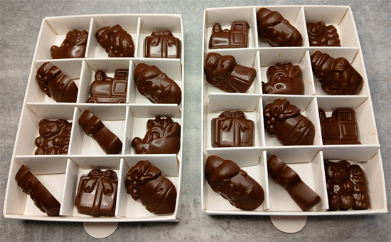 CALENDRIER de l'Avent (VERT, BLANC ou ROUGE) en chocolat NOIR 56% adouci à la poudre de riz BIO vegan sans allergènes Exquidia, créé dans notre atelier. Le voilà, avec ses irrésistibles 24 mini figurines de Noël pour attendre la nuit magique du 24 décembre.