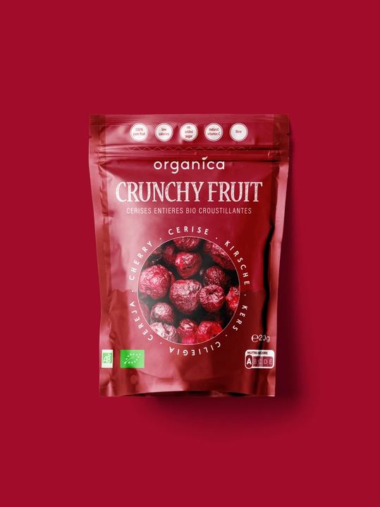 Délicieuses CERISES crunchy entières lyophilisées BIO vegan sans allergènes Organica. Elles sont élaborées à partir de cerises fraîches cueillies à parfaite maturité, puis lyophilisées à froid afin de préserver leurs nutriments essentiels, leur acidité naturelle et leur saveur fruitée authentique. Le résultat : un snack sain, croustillant et irrésistiblement gourmand, sans sucre ajouté ni additifs.