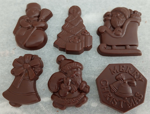 Cône SAPIN de Noël décoré contenant 6 figurines de Noël (Père Noël, Bonhomme de neige, Traineau du Père Noël, Sapin de Noël, Cloche, Merry Christmas) en chocolat NOIR 60% ONCTUEUX BIO vegan sans allergènes Exquidia, créées dans notre atelier.