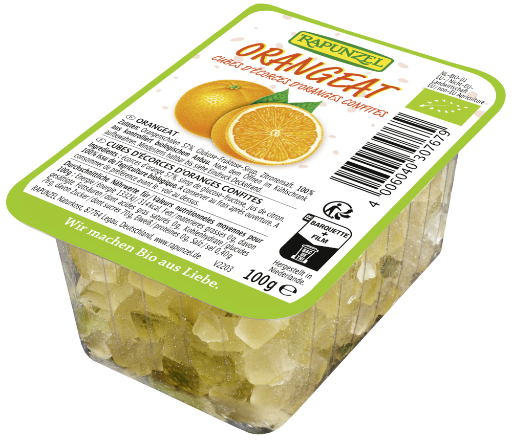 CUBES d'écorces d'ORANGE confites BIO vegan sans allergènes sans maïs Rapunzel. Les écorces d'orange confites possèdent un arôme délicieusement fruité et intense. Elles s'utilisent de multiples façons en pâtisserie ou pour sublimer vos desserts ; notamment les classiques comme le stollen, les florentins et le pain d'épices.