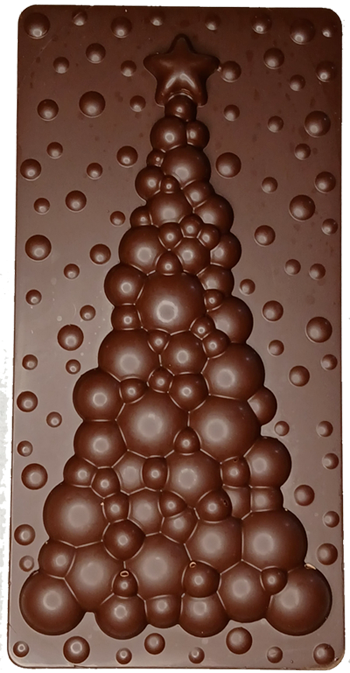 GRANDE tablette SAPIN DE NOËL avec boules en chocolat 47% adouci à la poudre de riz BIO vegan sans allergènes Exquidia, créée dans notre atelier.