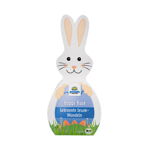 HOPPI le lapin de Pâques BIO, vegan, sans gluten, sans lait, sans lactose, sans œufs, sans soja, sans arachide, sans céleri, sans lupin, sans moutarde, sans poisson, sans mollusque, sans crustacé, sans sulfites GOVINDA : des amandes grillées enrobées d’une fine couche de sucre de canne croquant et sucré, délicatement rehaussées de graines de sésame pour une gourmandise croquante unique. Mais bien sûr, pensez aussi à vous et offrez-vous ce lapin de Pâques croquant et sucré.