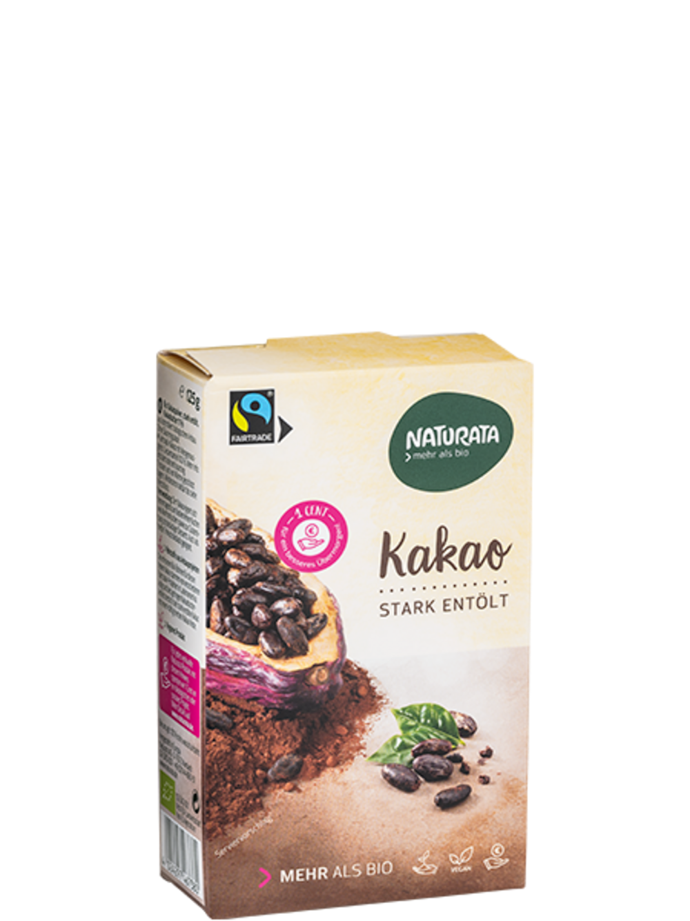 POUDRE de cacao fortement dégraissé BIO vegan sans allergènes Fairtrade Naturata. Leurs fèves de cacao proviennent de différents projets Fairtrade d’Amérique centrale et du Sud.