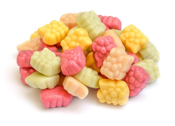 • ingrédients : sirop de glucose*, sucre de betterave*, raisins* 6,76%, pêche* 0,52%, fruit de la passion* 0,52%, jus concentré, de banane* 3,12%, mangue* 0,52%, kiwi* 0,52%, purée de fraise* 0,52%, gélatine de porc*, acidifiant : acide citrique, acide lactique; mangue naturelle, pêche, fraise, kiwi, arôme de vanille, extraits colorants de fruits et de plantes : sureau*, curcuma*, (carotte*, potiron*, pomme*, spiruline* carthame*), pectine, régulateur d'acidité : citrate trisodique ; agent d'enrobage : cire de carnauba*