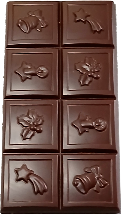 TABLETTE 8 motifs de NOËL (2 étoiles filantes, 2 bougies, 2 feuilles de houx, 2 cloches) en chocolat NOIR 56% adouci à la poudre de riz BIO vegan sans allergènes Exquidia, créée dans notre atelier. Le 56% est fait à partir du 47% et on y ajoute de la masse de cacao* PUR Criollo** (Origine : Pérou**).