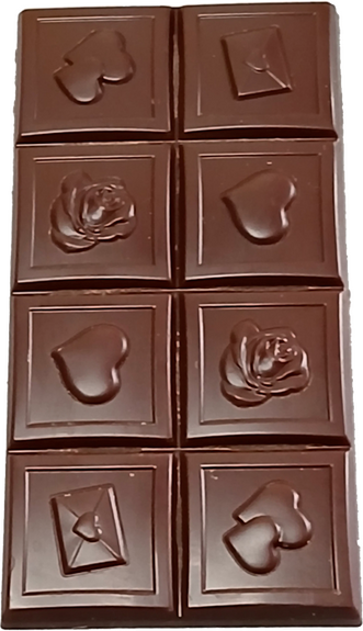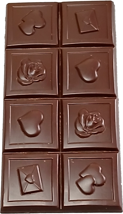 TABLETTE décorée de petits COEURS (coeurs, roses, enveloppes) en chocolat NOIR 56% adouci à la poudre de riz BIO vegan sans allergènes Exquidia, créée dans notre atelier. Le 56% est fait à partir du 47% et on y ajoute de la masse de cacao* PUR Criollo** (Origine : Pérou**).
