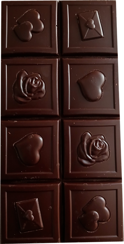 Délicieuse TABLETTE décorée de petits COEURS (coeurs, roses, enveloppes) en chocolat NOIR 60% ONCTUEUX BIO vegan sans allergènes Exquidia.