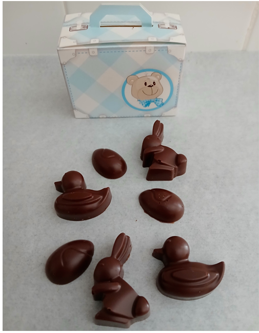 VALISETTE (LAPINS, CANARDS, OEUFS DE PÂQUES) en chocolat 47% adouci à la poudre de riz BIO sans allergènes vegan Exquidia, créés dans notre atelier. Emballage : jolie valisette à cacher dans le jardin.